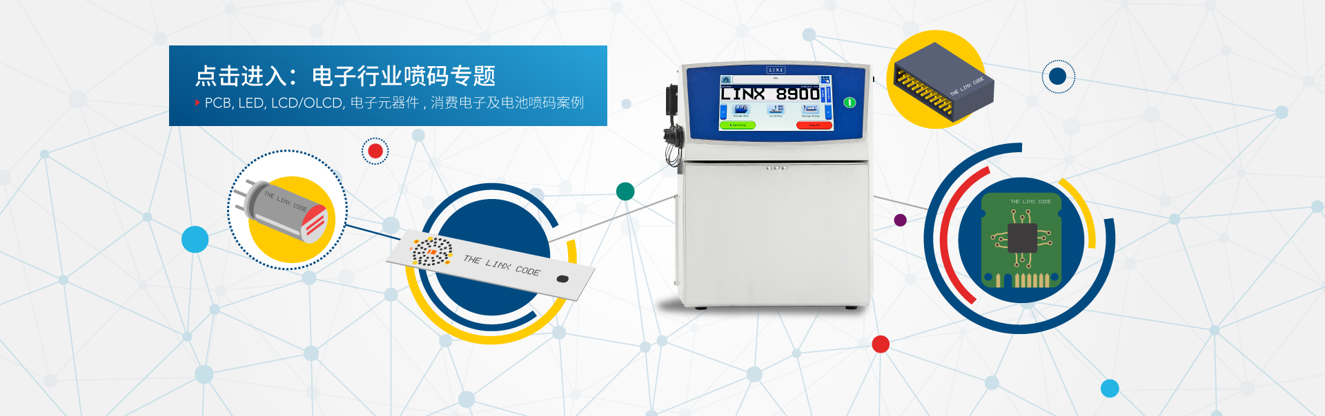 Linx連續(xù)噴墨噴碼機可為苛刻生產(chǎn)環(huán)境中的電子元器件提供可靠的產(chǎn)品標識碼。標碼高度低至 1.4 毫米 (CIJ) 和 0.8 毫米。